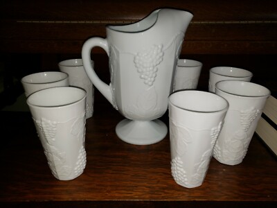 Vintage White Milk Glass Pitcher And 7 Glasses Grape Harvest Design Ebay