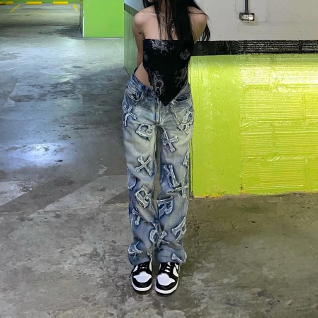 Ins High Street Letter Patch Jeans Female 2023 Spring New Style Gradient Blue High Waist Straight Leg Pants Aliexpress